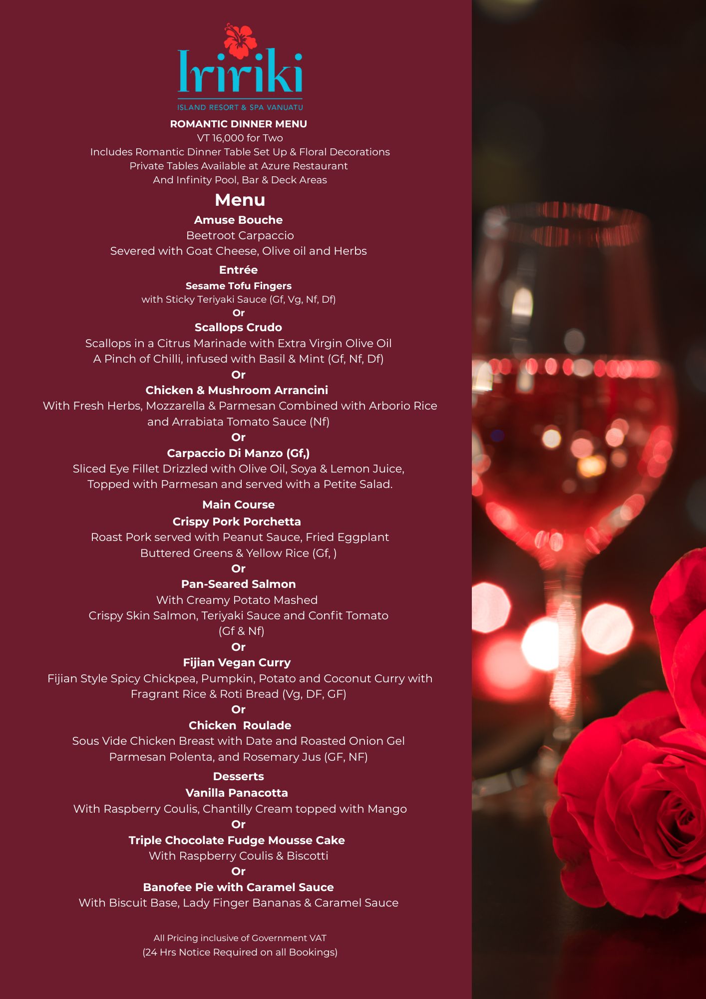 For those of you who plan to enjoy a sunset dinner with your loved one on the island, we have the perfect Iririki Romantic Dinner Menu